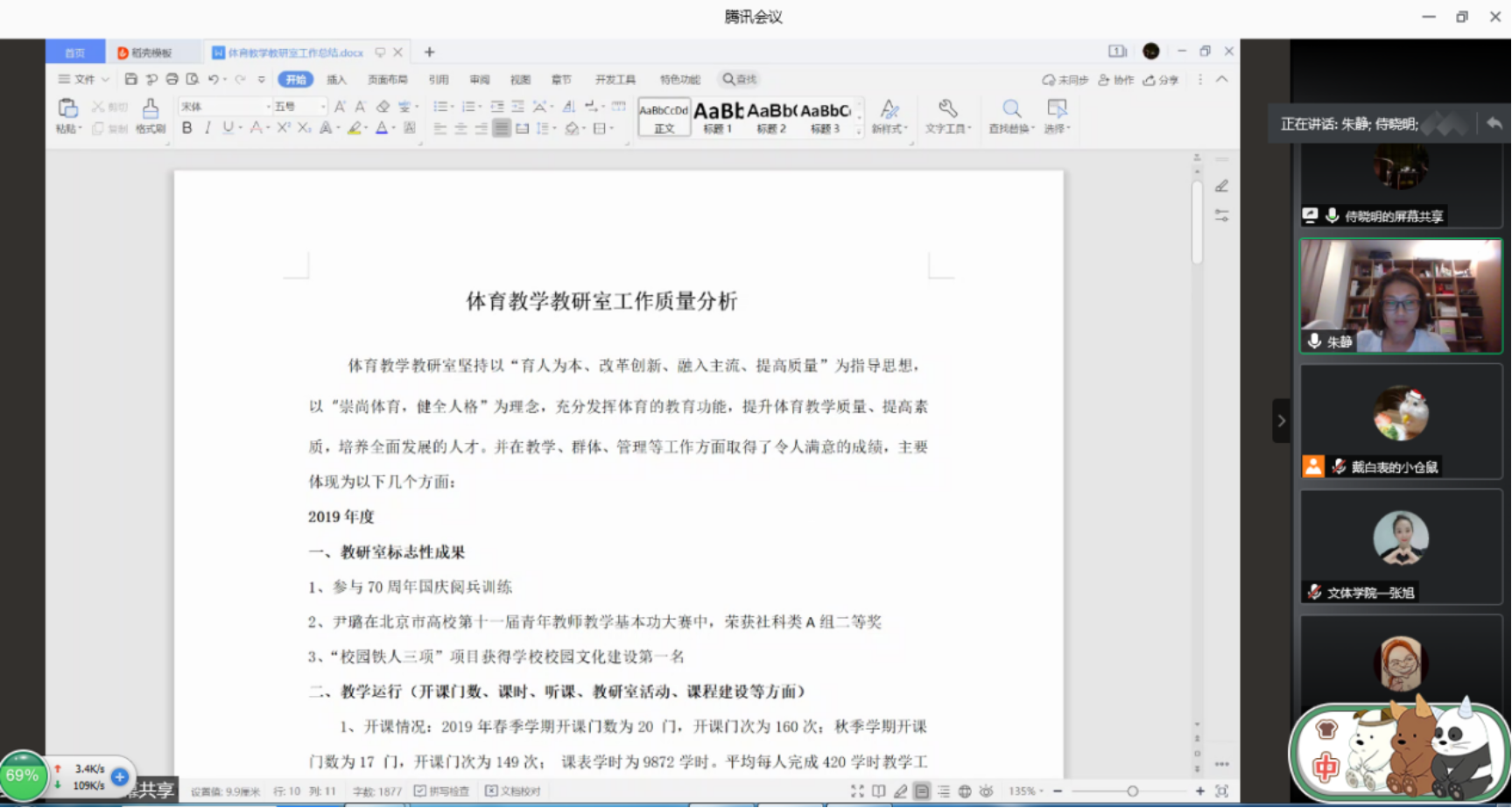 會議主要對文體學院各學科近一年來的教學工作進行總結。體育、人文和藝術三個學科的教研室主任分別從教學運行、科研工作、教學管理和開展活動等多個角度對各學科過去一年中取得的成就進行歸納,展現了各學科良好發展的面貌。