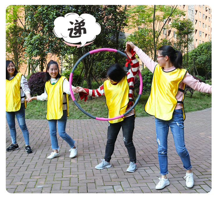 各學(xué)院以6名女生為單位,6人手拉手站成一排依次從呼啦圈中穿過,再折返,用時(shí)少的隊(duì)伍獲勝。在穿越呼啦圈的過程中6人如出現(xiàn)手手脫離將取消比賽資格。