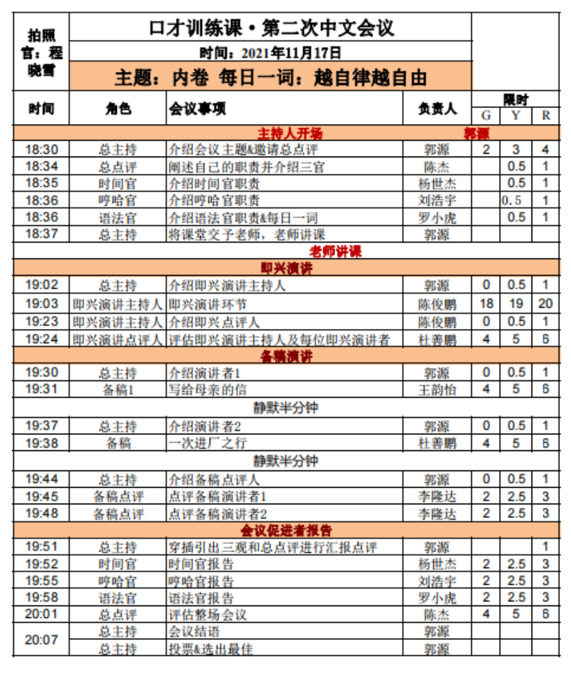 在探索的過程中,主講老師嘗試著將一種自組織、多角色、全方位、重反饋、嚴(yán)格時(shí)間管理的組織模式引入課堂,將每一次課程設(shè)計(jì)為一次會(huì)議,請同學(xué)們來設(shè)計(jì)會(huì)議流程。以最近一次的口才課為例,把堂課的時(shí)間交給小個(gè)組學(xué)生來安排和組織,讓他們成為課堂的主人。