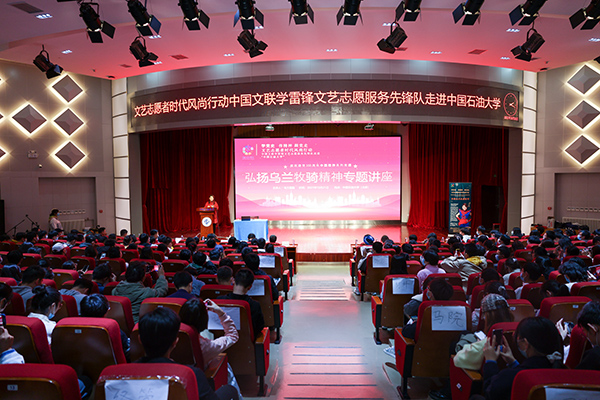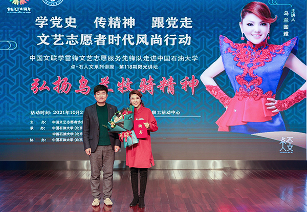 10月21日下午,“學黨史 傳精神 跟黨走 文藝志愿者時代風尚行動”中國文聯學雷鋒文藝志愿服務先鋒隊做客中國石油大學(北京)點·石人文系列講座暨第118期陽光講壇,宣講烏蘭牧騎精神。中國文聯文藝志愿服務中心副主任、中國文藝志愿者協會副秘書長李巖,中國石油大學(北京)副校長金衍,團委、體育與人文藝術學院等部門和學院相關負責人以及300余名師生,現場聆聽了蒙古族青年歌唱家、全國學雷鋒先進典型“最美志愿者”榮譽稱號獲得者烏蘭圖雅帶來的精彩報告。