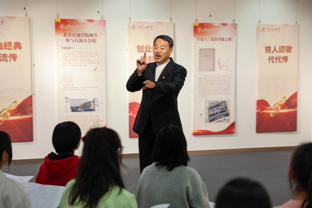 王永樺教授講授了《踏著鐵人腳步走》《我為祖國獻石油》這兩首經典石油音樂的創作背景、精神內涵,并細致地指導同學們如何將情感管理融入歌唱過程,要唱得準、能唱得穩。