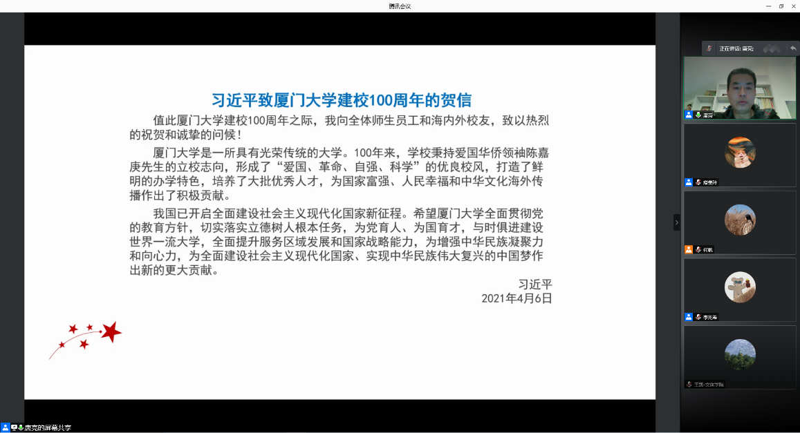 與會人員紛紛表示通過習(xí)近平總書記對廈門大學(xué)100周年的賀信,深刻感受到了習(xí)近平總書記對教育的關(guān)注,為國家的發(fā)展和戰(zhàn)略能力增強了凝聚力、向心力,更是為實現(xiàn)咱們的中華民族的偉大復(fù)興提出了希望。廈門大學(xué)是一所具有光榮傳統(tǒng)的大學(xué),總書記的賀信表達(dá)了黨和國家對高等教育的關(guān)注,也鼓舞了身為高校教師的我們,作為高校教師,我們要不忘初心,砥礪前行,始終堅守在教書育人的一線,為培養(yǎng)祖國的建設(shè)者不斷努力。