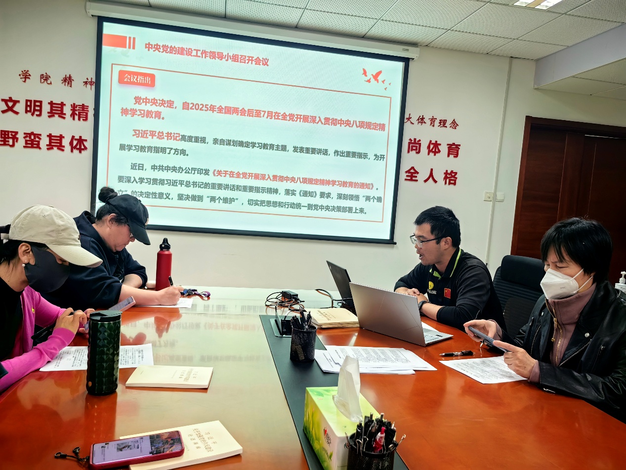 為推動深入貫徹中央八項規定精神學習教育走深走實,引導師生進一步統一思想、提高站位,以主動作為、勇于擔當、馬上落實的過硬作風,促進學校各項事業改革攻堅、取得突破,體育教研室教工黨支部與環工本科生黨支部和體育專業碩士研究生團支部于4月3日聯合開展2025年4月份黨支部組織生活和教職工政治理論學習。活動由體育教研室黨支部書記尹彥主持,體育教研室全體教師、環工本科生黨支部全體黨員學生和體育專業碩士研究生團支部全體學生參加。