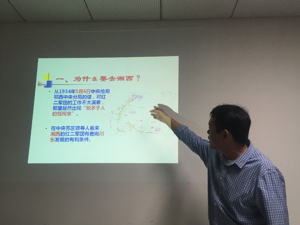 饒勝文老師從紅軍長征的背景講起,帶著大家共同回憶革命年代的點點滴滴,從長征中的動人故事和重要時間節點中總結中國共產黨人的革命精神和革命覺悟,與參加學習的支部黨員們用心重“走”長征路。饒勝文老師從紅軍為什么去湘西,第一次目標調整,赤化四川,再到北上陜甘寧,以及四渡赤水,遵義會議,瓦窯堡會議等的重要意義,講述了長征使紅軍受到的洗禮,將不屈不撓、艱苦奮斗、勵精圖治、排除萬難的長征精神傳達給每位與會人員,使長征精神貫徹在事業上的拼搏中和對自身的嚴格要求中。