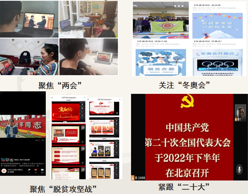 計(jì)算機(jī)20-3團(tuán)支部關(guān)注時(shí)事,定期學(xué)習(xí)黨的理論知識(shí)。先后組織學(xué)習(xí)“脫貧攻堅(jiān)戰(zhàn)”“兩會(huì)”“冬奧會(huì)”“建團(tuán)百年講話”“二十大”等熱門時(shí)事,深入學(xué)習(xí)宣傳貫徹習(xí)近平新時(shí)代中國特色社會(huì)主義思想,不斷提高思想政治水平。并針對每個(gè)專題學(xué)習(xí)制作原創(chuàng)視頻五篇,發(fā)布在公眾號(hào)上,影響身邊更多的同學(xué)提高思想政治水平。
