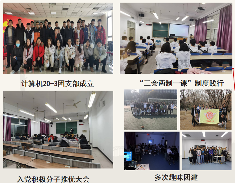 計(jì)算機(jī)20-3團(tuán)支部成員積極向黨團(tuán)組織靠攏,自成立以來發(fā)展,有新團(tuán)員2人,入黨申請書提交率:100%此外,支部堅(jiān)持“三會(huì)兩制一課”制度。定期召開支委會(huì)、組織生活會(huì)。開展奧森公園團(tuán)建、觀看愛國電影、冬至聯(lián)歡會(huì)、冬奧會(huì)宣講、門球競技賽等特色團(tuán)建。