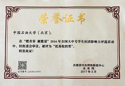 近日,共青團中央網(wǎng)絡(luò)影視中心、團中央未來網(wǎng)公布了“燃青春 聚能量”2016年全國大中專學(xué)生社團影響力評選活動結(jié)果。石大獲2016年全國大中專學(xué)生社團影響力評選活動優(yōu)秀組織獎,并有4家學(xué)生社團獲得優(yōu)秀社團獎。