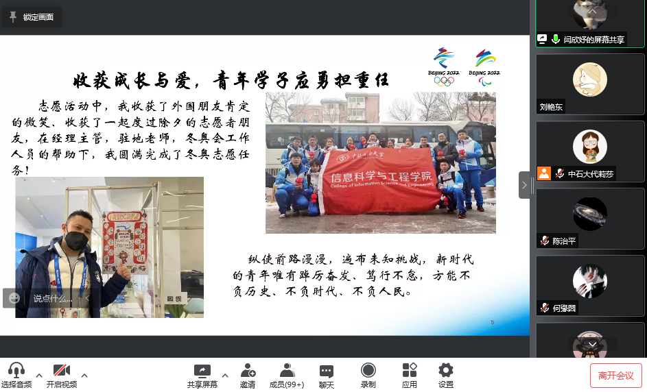 為弘揚雷鋒精神,激勵和引導廣大學生投身志愿服務,在全國第59個學雷鋒紀念日和第23個中國青年志愿者服務日到來之際,中國石油大學(北京)信息科學與工程學院舉辦“喜迎建團百年,共譜青春華章”主題團課。學院冬殘奧會志愿者付成功,冬奧會志愿者喬佳瑜、吳一凡、陳欣妍、閆欣妤和蘇星源,與學院全體團學干部和2021級本科團員相聚“云端”,暢談志愿服務的點滴感動與團員青年的責任擔當。