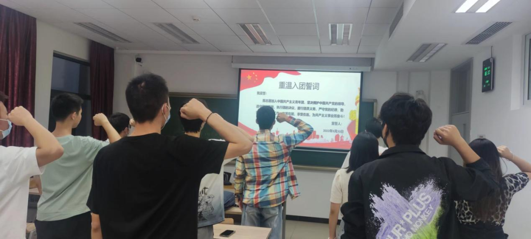 最后,全體團員高舉右手,緊握右拳,在團支部書記胡梓軒的領(lǐng)誓下,鄭重地重溫入團誓詞:“我志愿加入中國共產(chǎn)主義青年團........”,錚錚誓詞在活動室里回蕩,團員們表情莊嚴(yán)肅穆,誓詞鏗鏘有力,在這莊嚴(yán)神圣的氛圍中,青年團員們接受了一次思想的洗禮和心靈的震撼,引導(dǎo)著他們在接下來的學(xué)習(xí)、工作中不忘誓言,不辱使命,永葆先進。