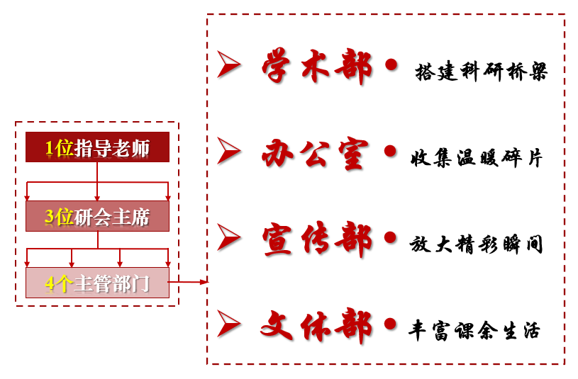 石工研會(huì)建立1位老師指導(dǎo)3位主席分管4個(gè)部門工作的“1+3+4”型組織管理模式,打造多方位、有特色的創(chuàng)新型學(xué)生組織。部門各司其職,相互協(xié)作,使學(xué)術(shù)與生活交融,科研與藝術(shù)邂逅,在熱情與才華的碰撞中釋放壓力,推動(dòng)研會(huì)各項(xiàng)工作順利展開(kāi)。