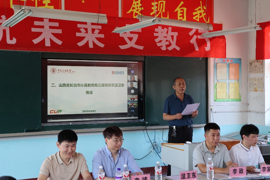 溫衛(wèi)東代表縣教育局歡迎實踐團(tuán)老師同學(xué)的到來,表示此次活動是沁縣優(yōu)化整合教育資源、大力促進(jìn)城鄉(xiāng)教育融合發(fā)展的重要舉措,縣教育局將認(rèn)真指導(dǎo)服務(wù)此次夏令營活動,并期盼未來有更多志愿者來到沁縣,為沁縣教育改革發(fā)展貢獻(xiàn)青春力量。