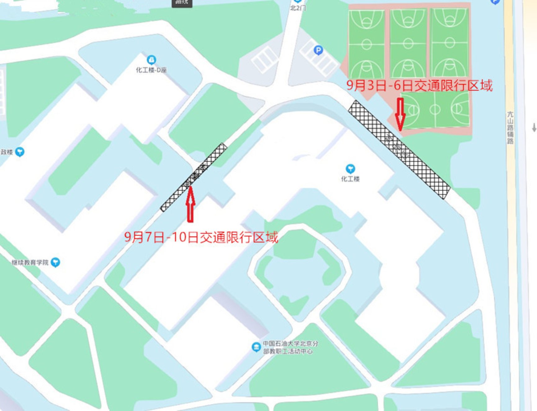 因化工樓A座外掛通風(fēng)管需要吊車施工。將于9月3-10日對化工樓A座區(qū)域分兩次實(shí)施交通管制,限制人員車輛通行,如圖所示。