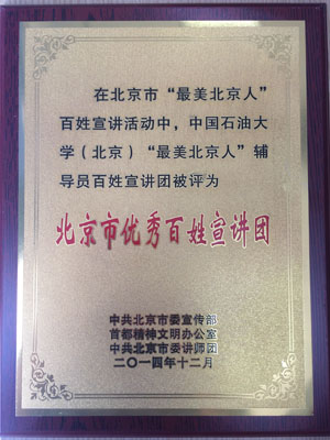 日前,北京市委宣傳部、首都文明辦、北京市委講師團聯合召開“最美北京人”百姓宣講活動總結表彰大會,中國石油大學(北京)“最美北京人”輔導員宣講團榮獲“北京市優秀百姓宣講團”榮譽稱號,是北京高校唯一獲獎的宣講團。