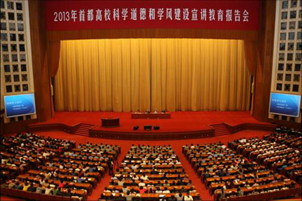 9月24日,中國石油大學150名研究生新生赴人民大會堂參加了2013年首都高校科學道德和學風建設宣講教育報告會。此次報告會由中國科協、教育部、中國科學院、中國社會科學院、中國工程院聯合舉辦,來自首都高校和科研院所的近6000名研究生新生及各高校部門領導及專家參加了大會。