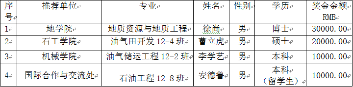 根據《北京中國石油大學教育基金會“王濤英才獎學金”管理辦法(試行)》的相關規定,經學院推薦,學生答辯,專家投票。擬推薦下列四位同學為2013-2014學年王濤英才獎學金獲得者,名單如下:
