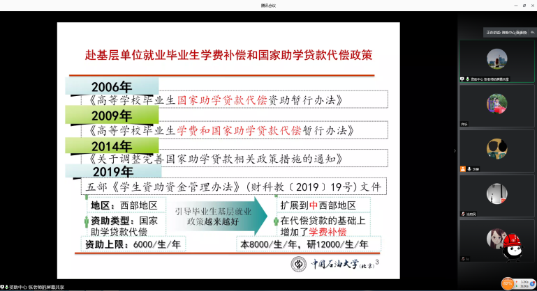 為幫助2020屆畢業(yè)生了解國(guó)家基層就業(yè)學(xué)費(fèi)補(bǔ)償補(bǔ)償貸款代償政策,扎實(shí)做好我校畢業(yè)生基層就業(yè)學(xué)費(fèi)補(bǔ)償貸款代償工作。6月10日,學(xué)生資助管理中心采用騰訊會(huì)議形式舉辦2020年畢業(yè)生基層就業(yè)學(xué)費(fèi)補(bǔ)償貸款代償政策宣講會(huì)。學(xué)生資助中心全體人員、各學(xué)院(研究院)資助負(fù)責(zé)人、畢業(yè)班輔導(dǎo)員及200余名2020屆畢業(yè)生參加了會(huì)議。