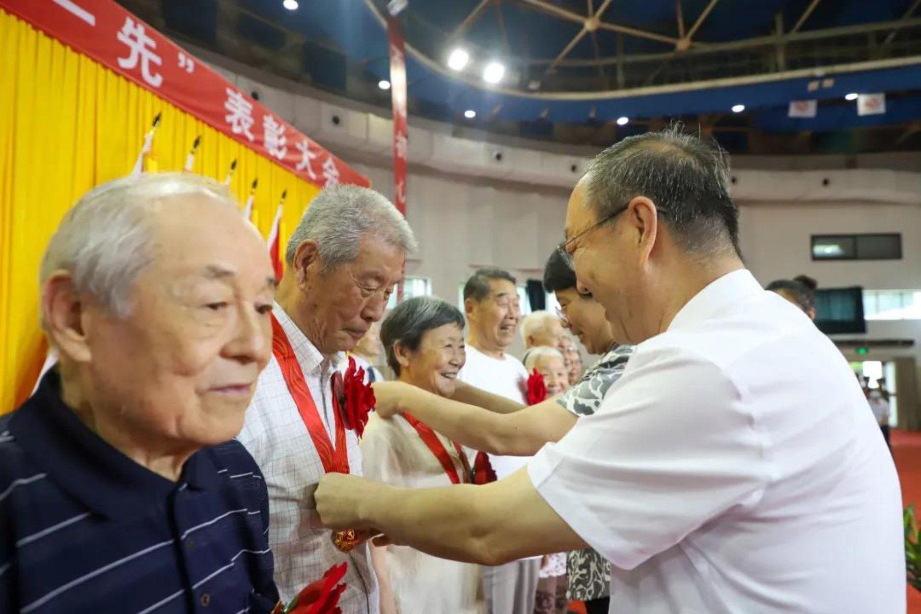 大會(huì)在雄壯的國(guó)歌聲中拉開(kāi)帷幕,會(huì)議首先舉行了“光榮在黨50年”紀(jì)念章頒發(fā)儀式,陳峰和吳小林為到會(huì)的34名老黨員代表頒發(fā)紀(jì)念章,新黨員代表集體為老黨員獻(xiàn)上鮮花。黨委副書(shū)記雷玉江宣讀了“光榮在黨50年”紀(jì)念章獲得者名單,學(xué)校共有90名老黨員獲頒紀(jì)念章。